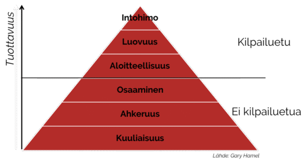 Herättävää Hamelin pyramidissa on se, etteivät nämä kolme alinta tasoa luo yritykselle lainkaan kilpailuetua. Ensimmäinen kilpailuetua tuova taso onkin aloitteellisuus. Tällöin työntekijä nostaa itse käden pystyyn, kun tietää, että asian voisi tehdä fiksumminkin. Hän alkaa välittää työstään.