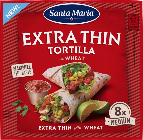 Tammikuun lopussa Santa Maria tuo markkinoille myös Santa Maria Extra Thin Tortilla with Wheat ja Santa Maria Extra Thin Tortilla with Whole Wheat. Uudet, ohuemmat tortillaletut ovat 25 % kevyempiä ja ohuempia kuin alkuperäiset tortillaletut (koko M), jolloin täytteet pääsevät loistamaan. Ohut ja joustava tortillalettu on täydellinen wrappeihin ja nopeisiin lounaisiin. Joustava ja helposti taitettava, täytä suosikkivihanneksilla, kastikkeella ja proteiinilla.